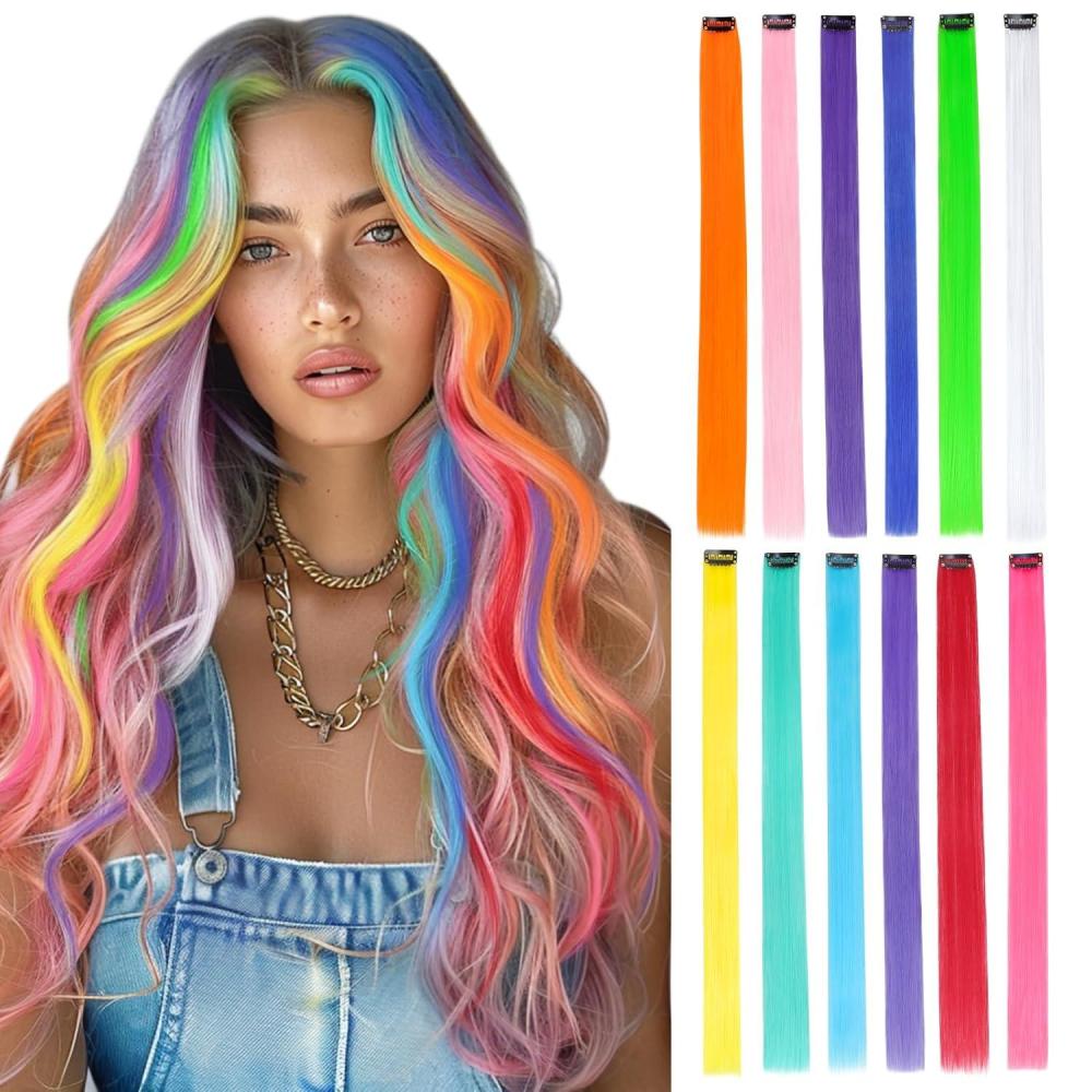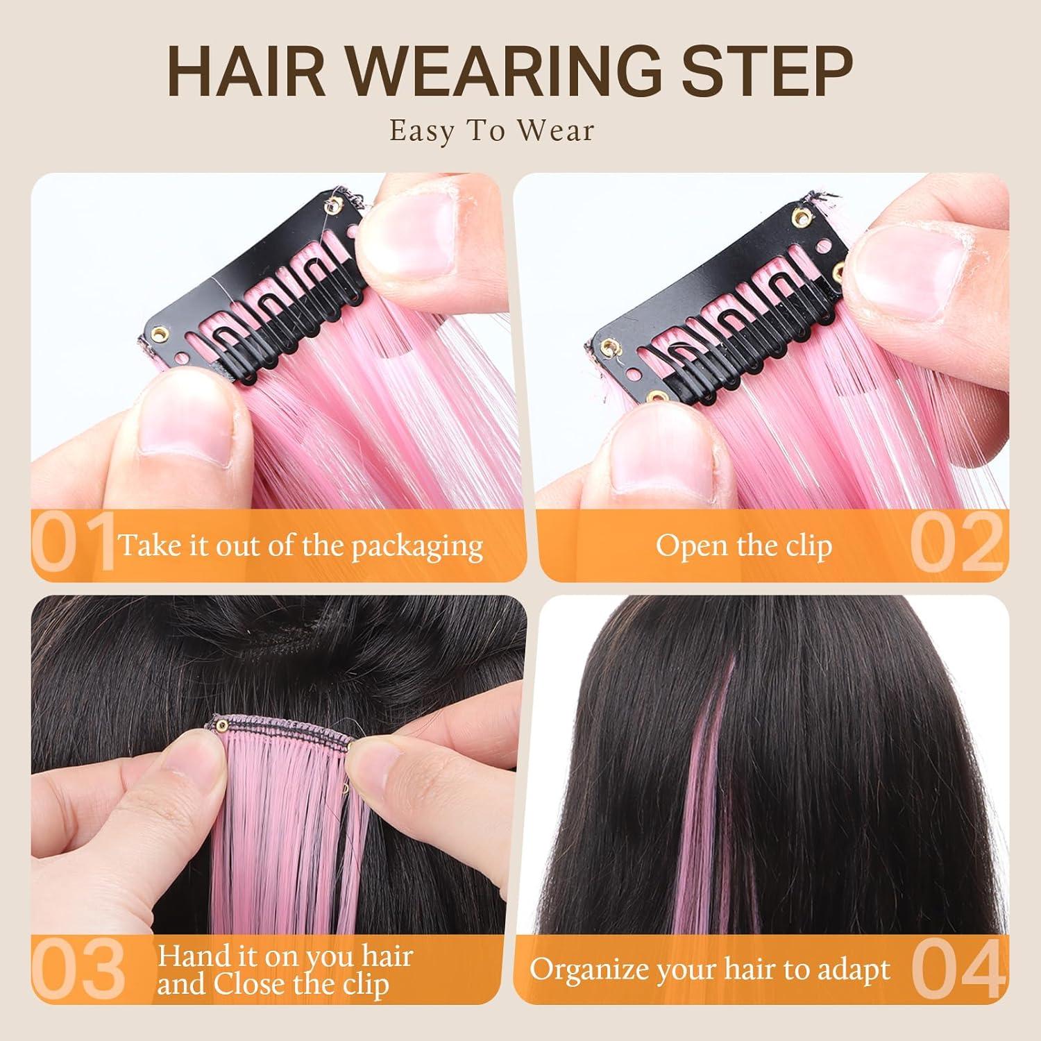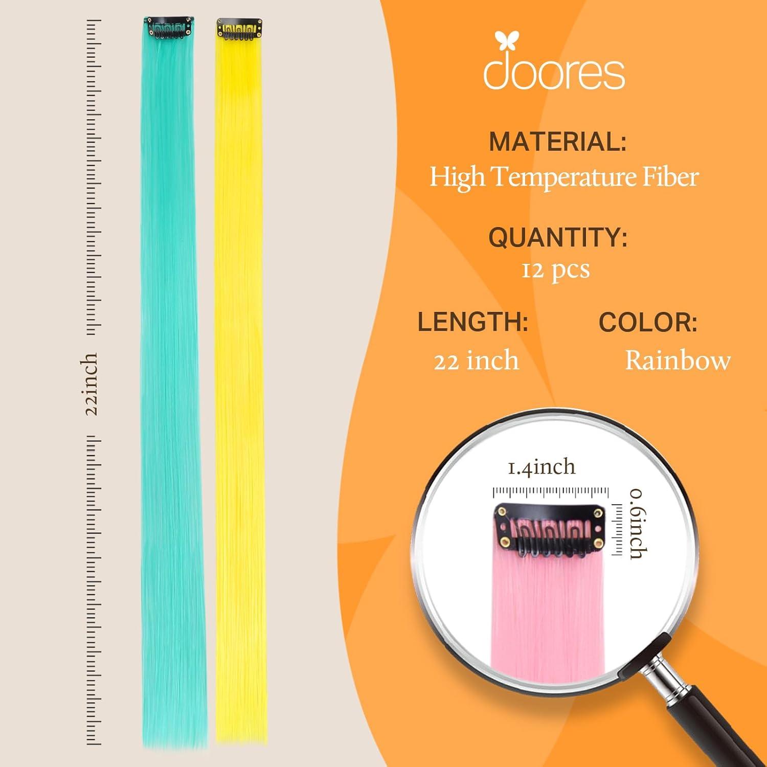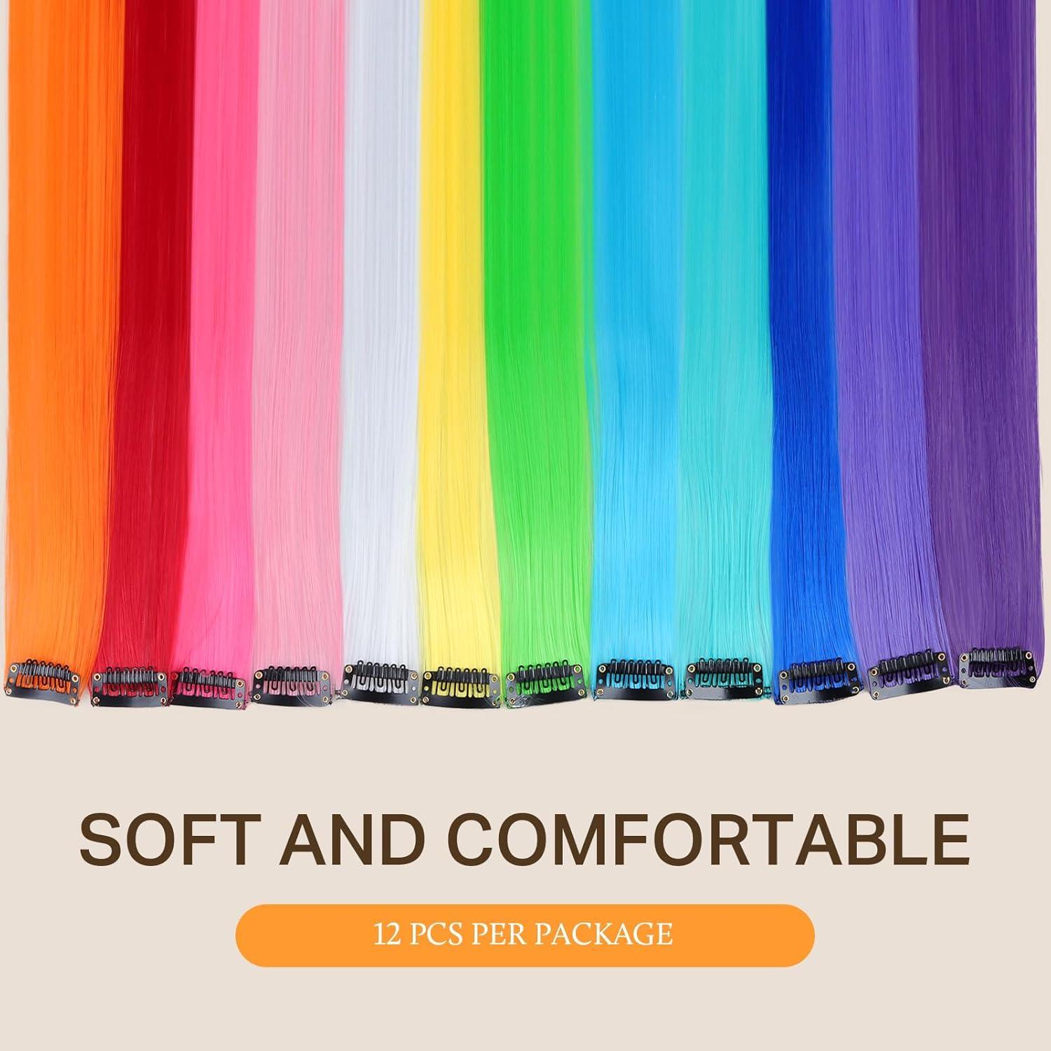 Easy to Use: 12 Pcs/pack, 22 inches each. The colored extensions are long enough that you can trim them to your hair length, style or braid them, or use them as highlights where you want them. Simply open or close the clips to put on and take off