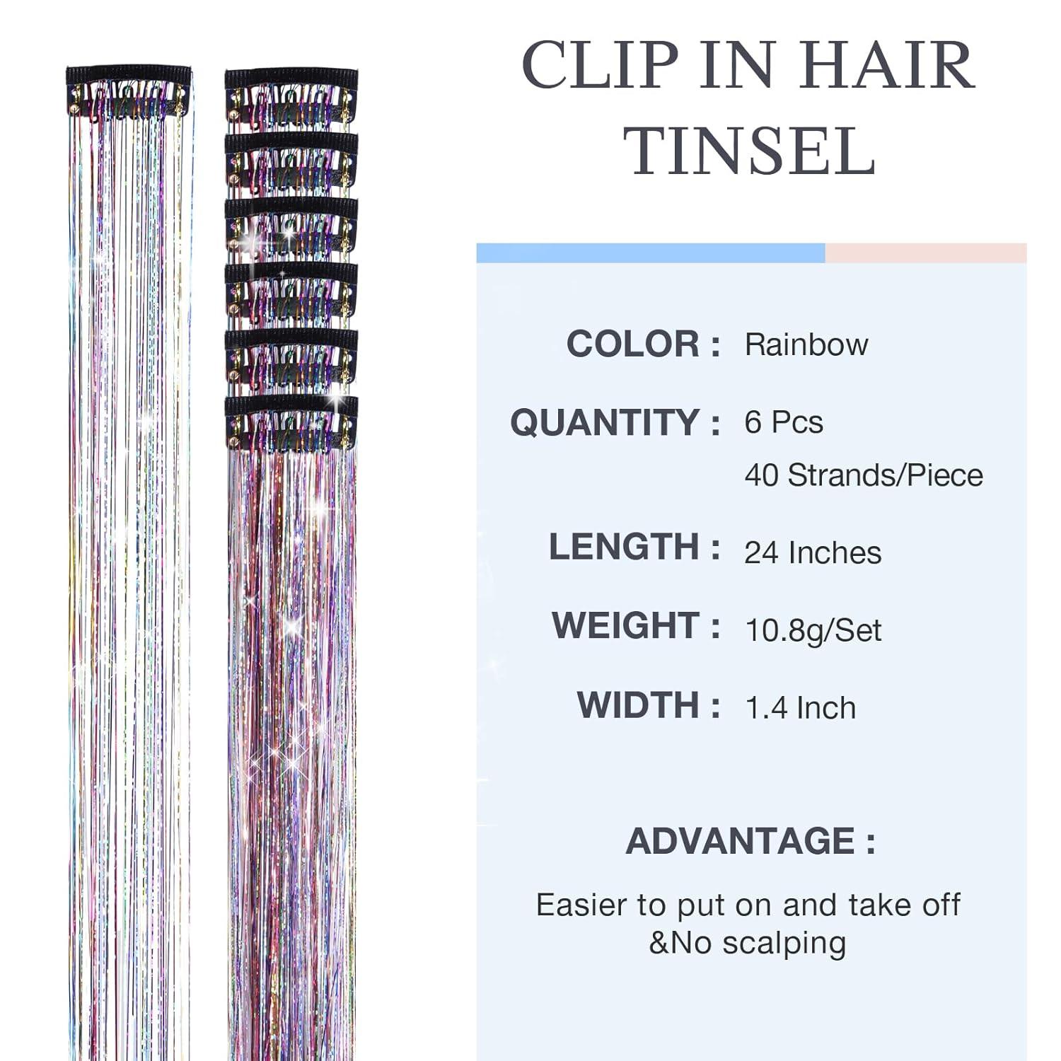 DOORES Clip in Hair Tinsel Kit 6 Pcs 24 Inch, Rainbow Glitter Tinsel Hair Extensions Girls Women & Kids Heat Resistant Dazzle Fairy Hairstyles Decoration Kit for Birthday Party Christmas Halloween(#16 Color)