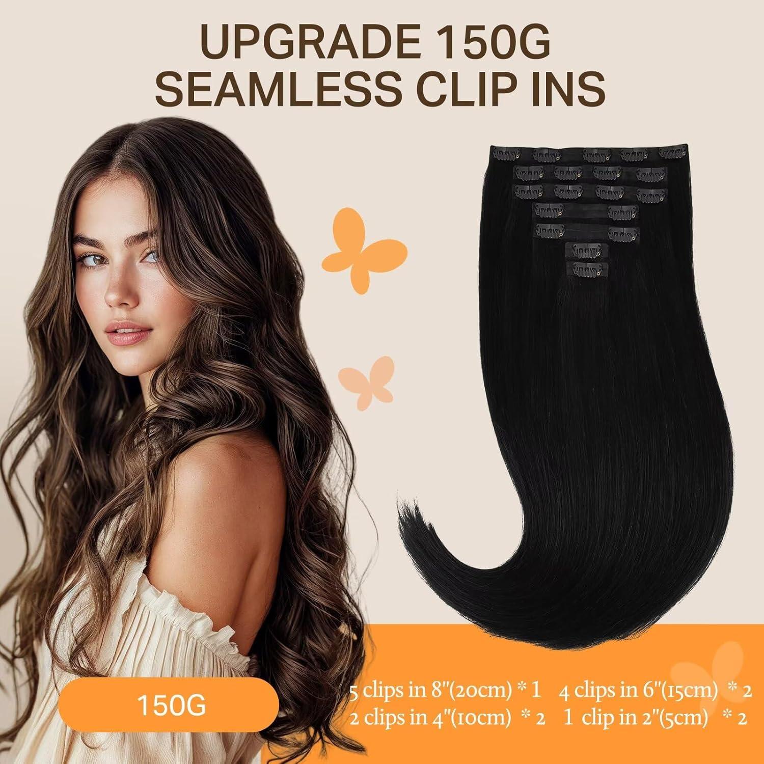 DOORES Clip in Hair Extensions Real Human Hair, Jet Black 150g 7pcs 20 Inch Invisible Edge Clip in Extensions Long Straight Weft for Women