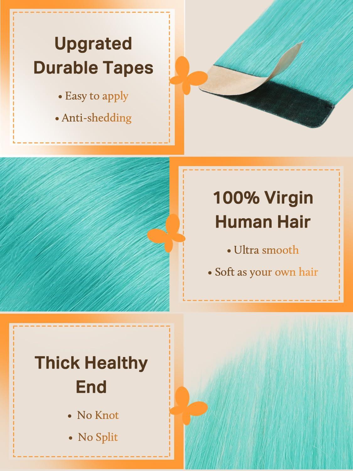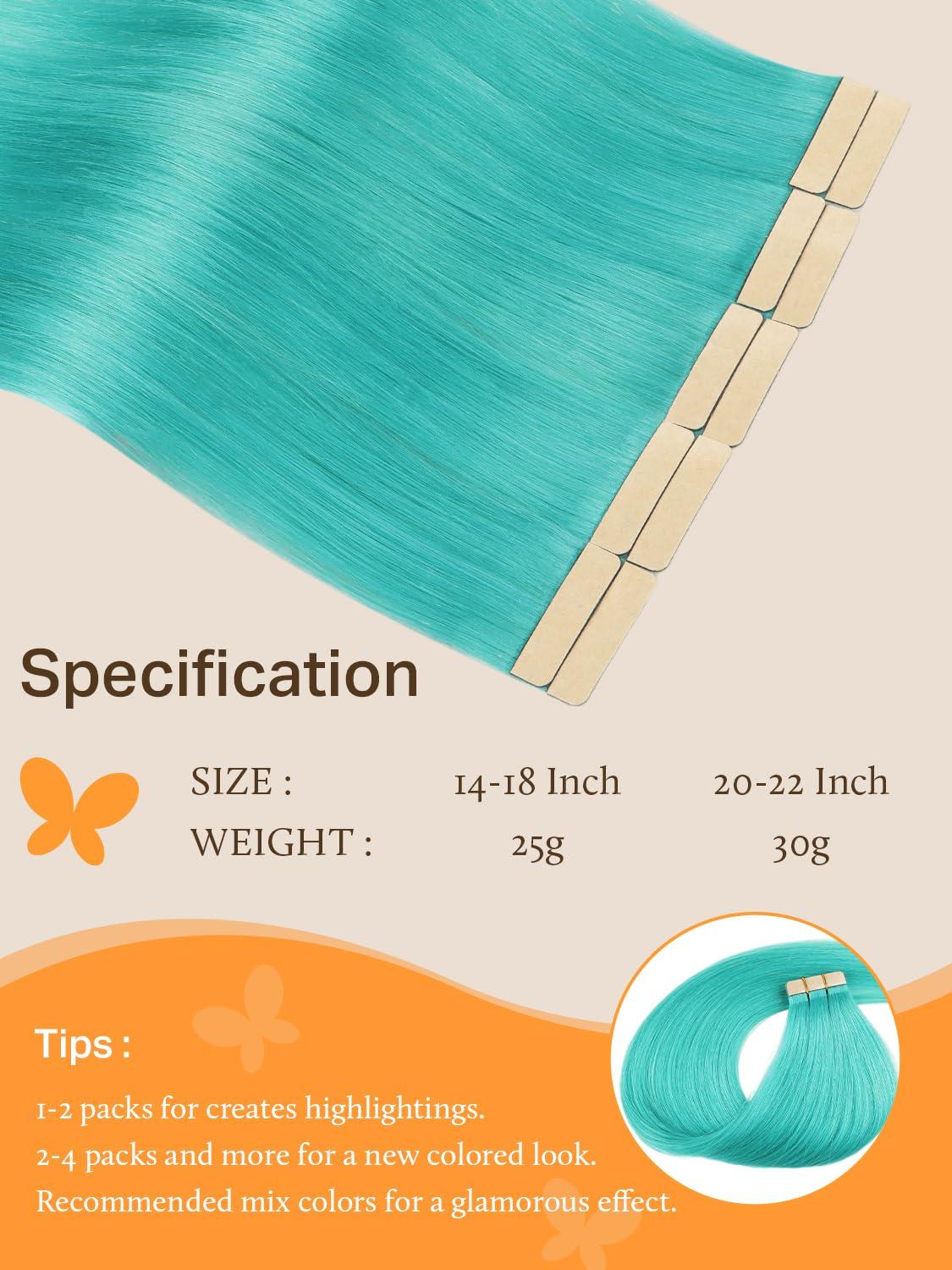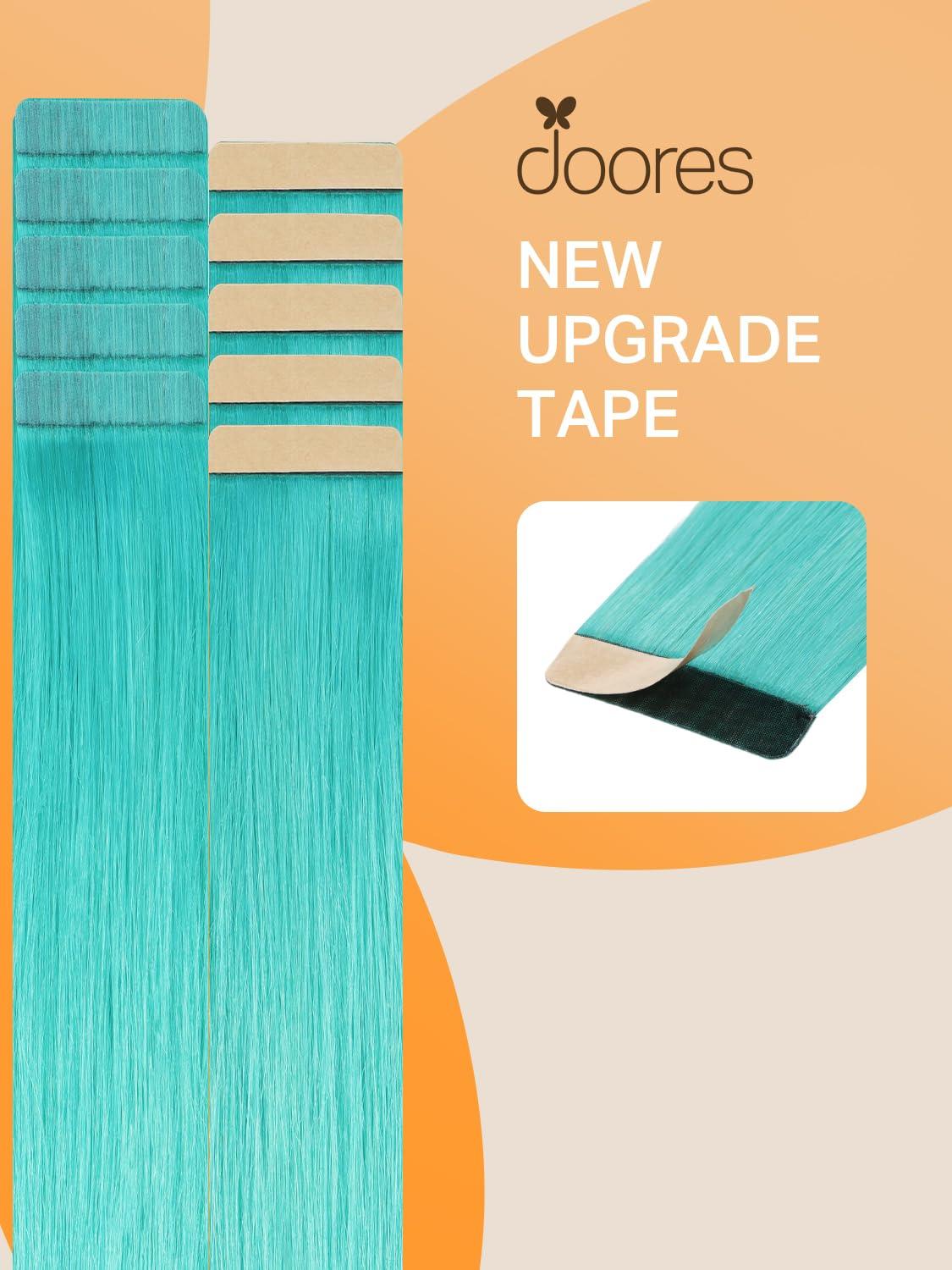 DOORES Human Hair Extensions, Teal Green Tape, Straight, 25g 10pcs 16 Inch