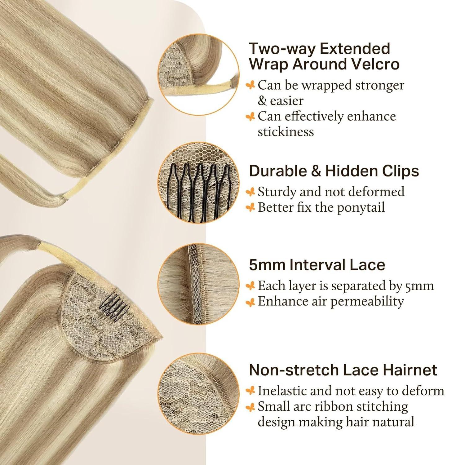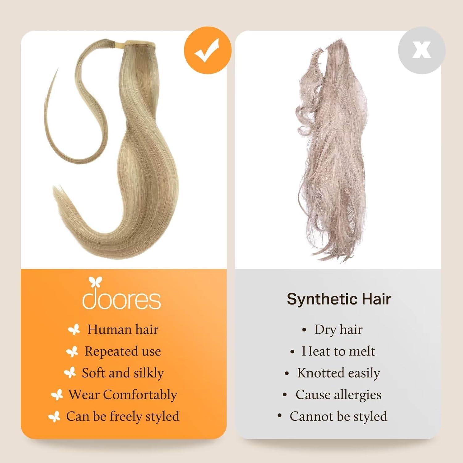 imageDOORES Ponytail Extension Human Hair Extensions Platinum Blonde 18 Inch 80g Clip in Hair Extension Ponytail Straight Wrap Around Hair Extensions Remy Human Hair with Magic Paste Natural Hair18A613A Dark Blonde Highlighted Bleach Blonde