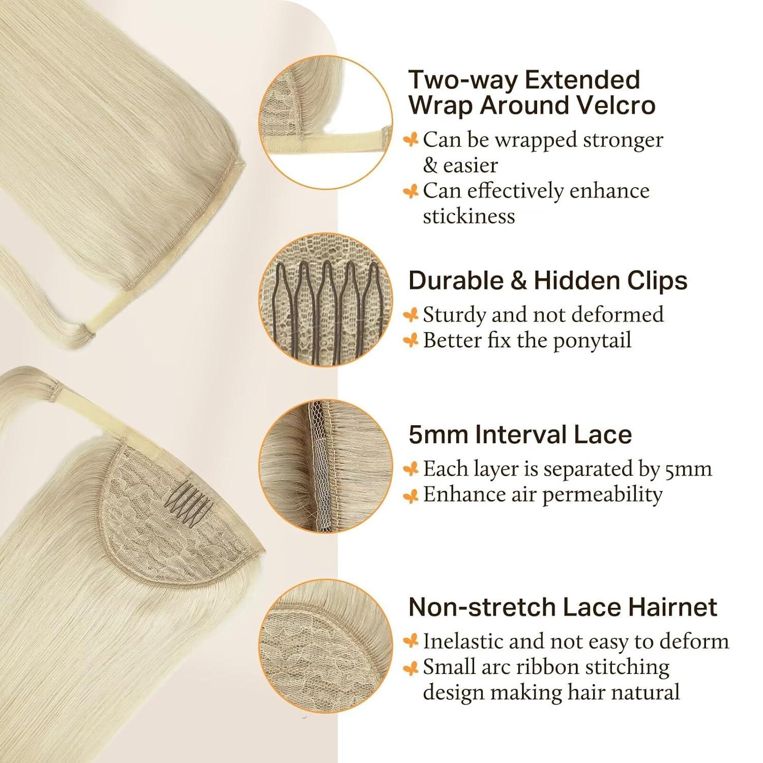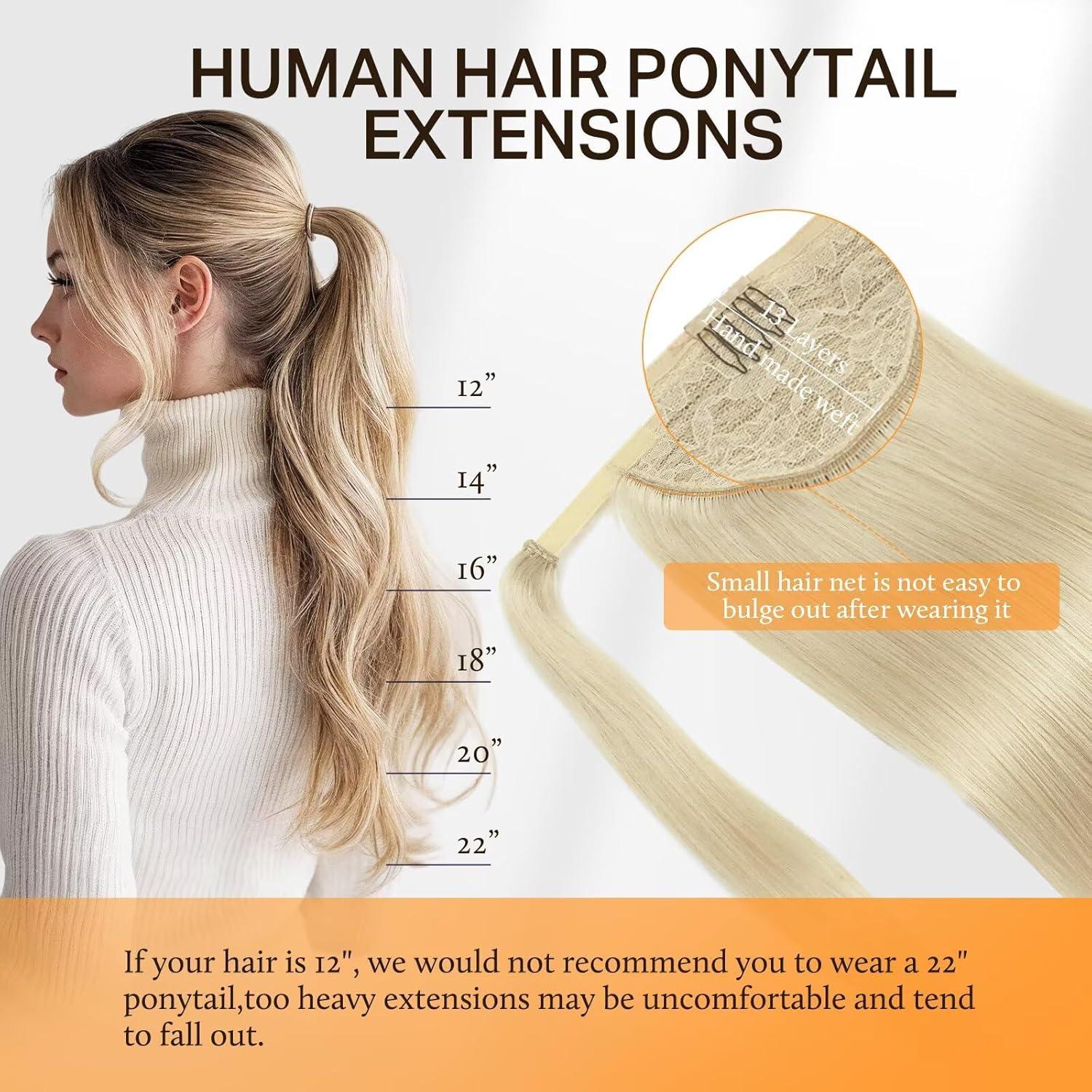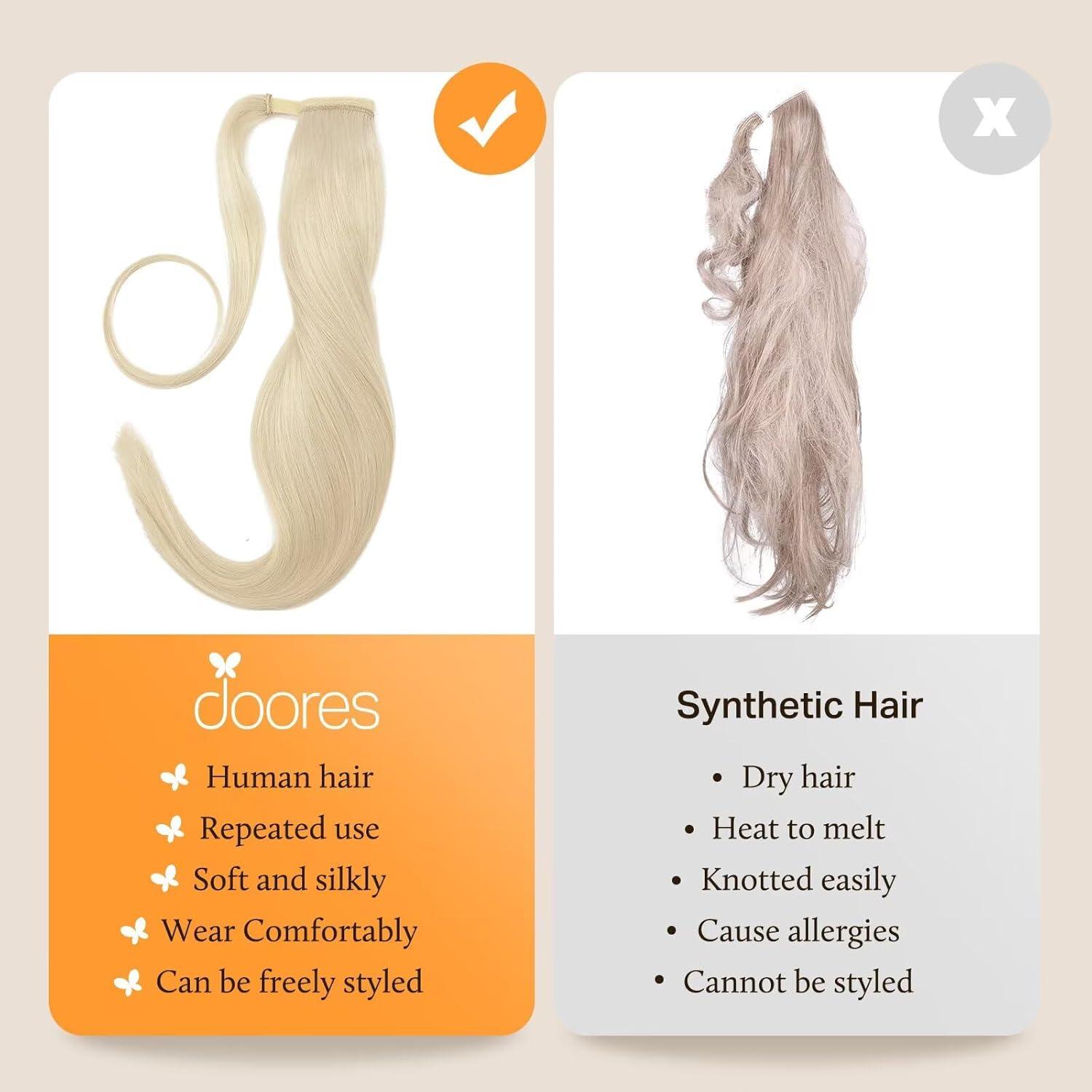 DOORES Ponytail Extension Human Hair Extensions Platinum Blonde 18 Inch 80g Clip in Hair Extension Ponytail Straight Wrap Around Hair Extensions Remy Human Hair with Magic Paste Natural Hair(#60A Platinum Blonde)